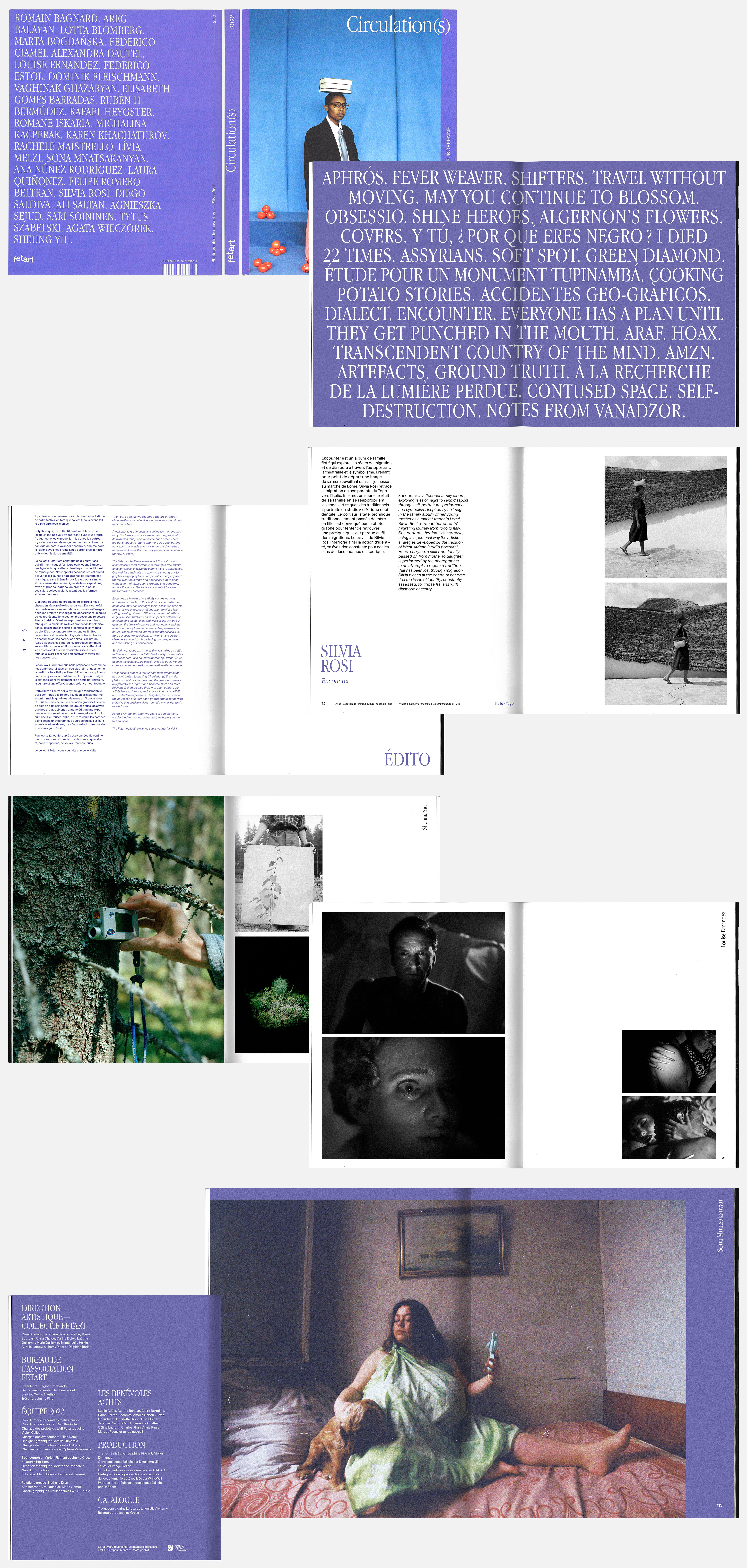 Ma première mission a été de repenser le catalogue d’exposition du festival. Pour la première année, le collectif n’a pas été accompagné par leur maison d’édition habituelle et s’est donc autoédité. Ayant la volonté de clôturer une collection, la couverture est restée assez similaire aux années précédentes. J’ai eu en charge toute la création graphique du reste du catalogue : conception d’une identité propre à cet ouvrage et en cohérence avec l’identité du festival, création des pages pub, mise en page et structuration. Mon rôle a été de la conception à l’envoi en production, jusqu’au lien avec les imprimeurs.