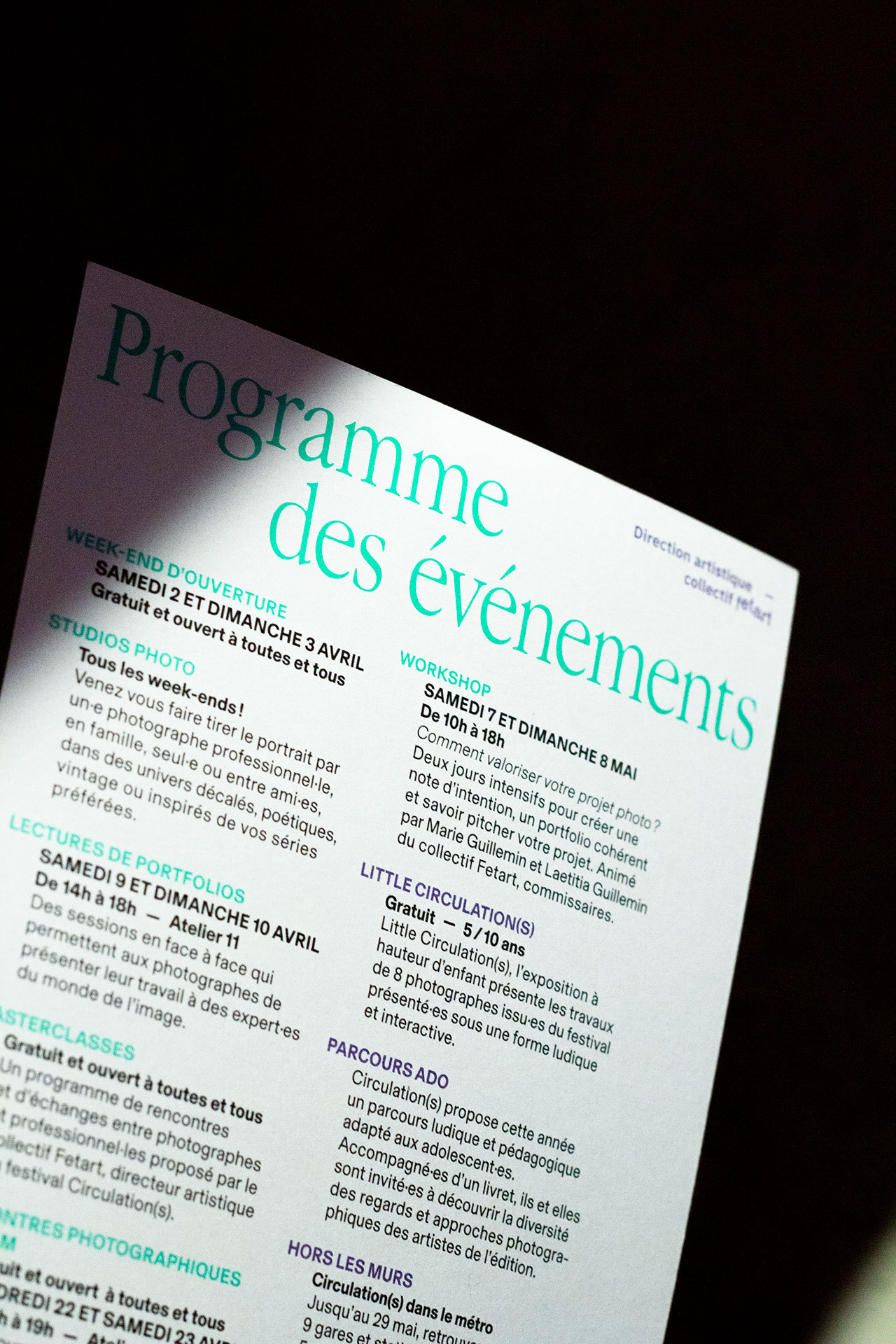 Mes autres missions ont été de décliner les supports de communication — affiche, dépliant programme, flyers, invitations, goodies — ainsi que la signalétique du festival — édito, totems de malau, stickers, cimaises, etc. — selon l’identité créée par Twice studio en 2021.